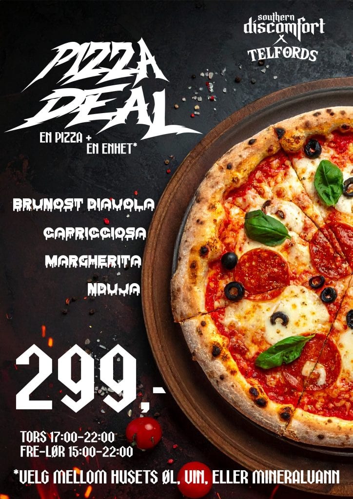 Trenger du å prime motoren før festival? Mellom klokken 15 og 22 fredag og lørdag (og 17-22 torsdag) får du en enhet drikke fra standardutvalget og en håndverkspizza på Telfords til kun kr 299,-. Pizzaene kommer fra restaurant Grenseløs, og du må gjøre ditt beste for å velge mellom Nduja, Capricciosa, Margherita og såklart deres legendariske Brunost Diavola. Du kan velge mellom pils, mineralvann og husets røde eller hvite til maten.